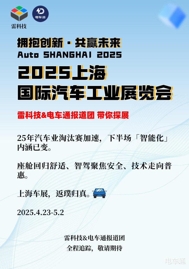 2025上海国际汽车工业展览会(上海车展)将于4月23日至5月2日隆重举行,本届车展以“拥抱创新 共赢未来”为主题,是汽车行业下半场的分水岭。届时,包括比亚迪、鸿蒙智行、小鹏、小米、深蓝、岚图等头部品牌将悉数登场,除新车型密集亮相外,智能技术的普惠、超充技术的突破、智驾安全的升级、座舱舒适的提升,都将是重要看点。雷科技旗下“关注电动车,更懂智能化”的账号电车通派出报道团前往上海现场,进行一线专业报道,敬请关注。